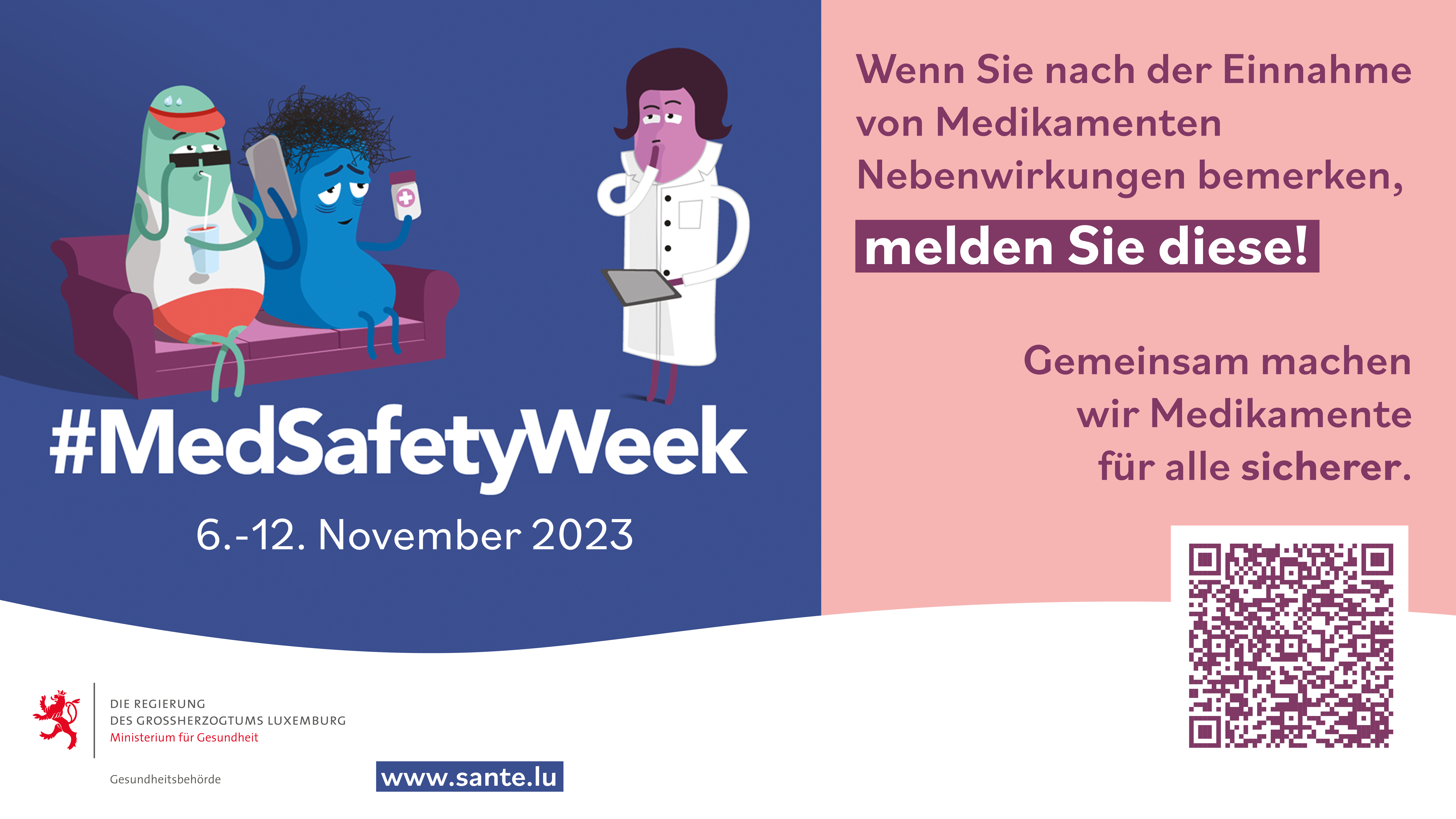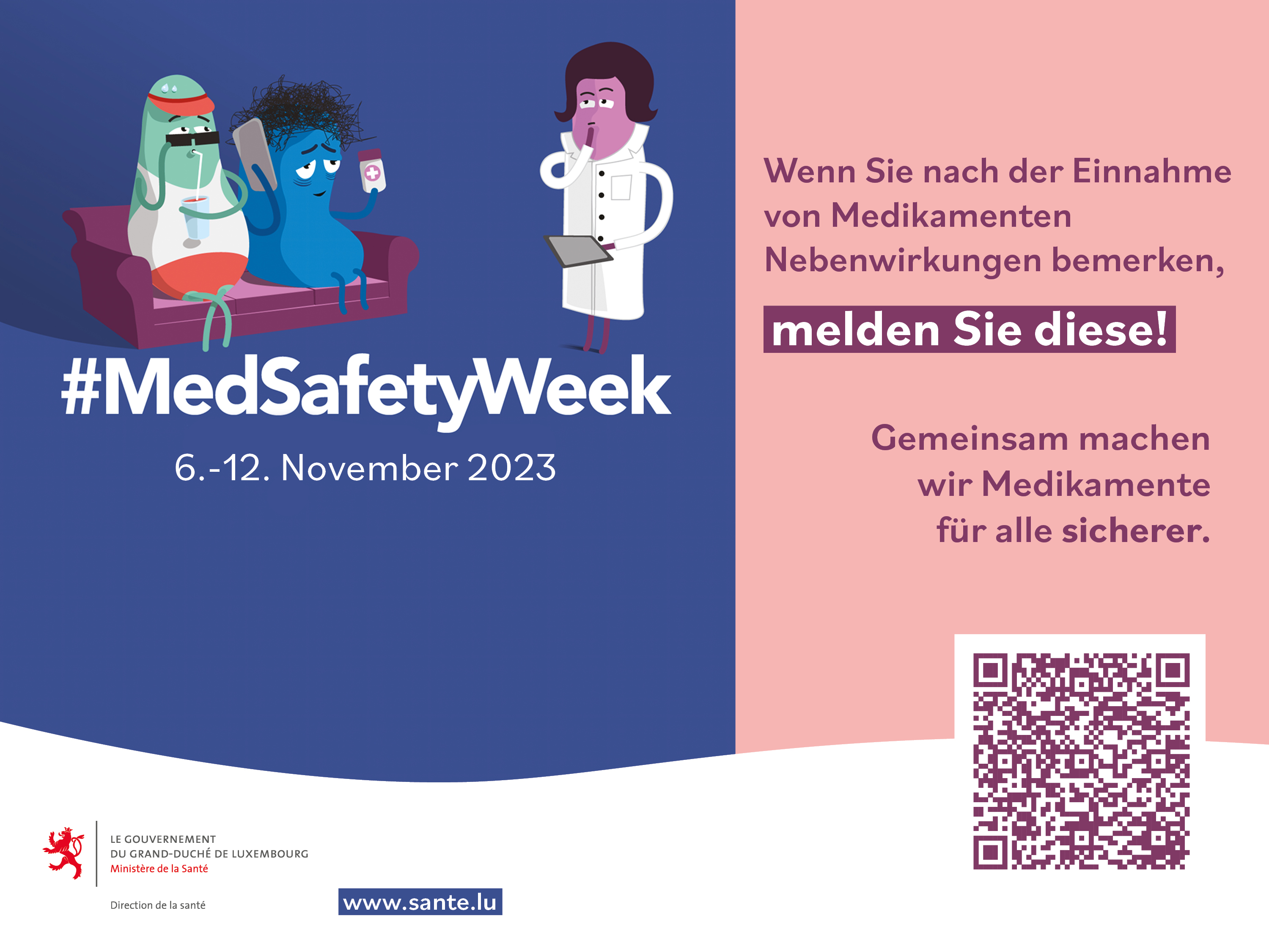 Comme l’an dernier, l’édition 2023 de la « Medsafetyweek » fera à nouveau appel aux pharmaciens du Luxembourg comme ambassadeurs de la sécurité des médicaments. Des supports de communication seront mis à disposition dans les pharmacies afin de sensibiliser le pubic à cette thématique. Les patients, mais aussi les professionnels de santé, sont encouragés à participer activement à la sécurité des médicaments en déclarant tout effet indésirable lié à une prise de médicament.